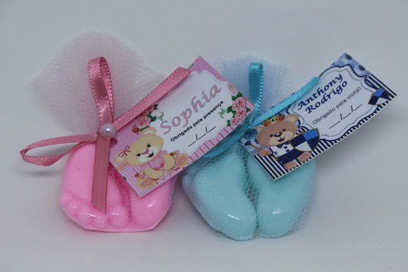 Sabonetes formato Par de pezinhos embalados papel filme,com tuly, lacinho perola, na cor selecionada.